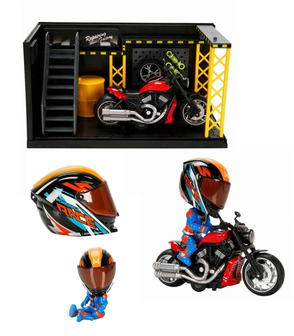 1:12 Sesli ve Işıklı Harley Wolverine Die Cast Çek Bırak Motosiklet ve Tamir Atölyesi Seti, alaşım gövdesi ile sağlamlığı, gerçekçi detayları ile sahne hissini bir araya getiriyor! Çek-bırak mekanizması sayesinde motosikleti geri çekip bıraktığında ileri doğru hareket ediyor; arka tekerleğe bastığında ise motor sürüş sesi, korna sesi ve ön far ışıkları devreye giriyor. Ön farlarından yayılan ışık, motor sesi ile birleşerek sahneyi canlandırırken; kutu içeriğindeki kask ve stant ile kurulumunu kendin yaptığın, ışıklı tabelası olan tamir atölyesi sayesinde kendi koleksiyon alanını sergileyebilir ve özelleştirebilirsin. Ayrıca motosiklet modeli üzerine gövdesi kask içerisinde yer alan eklemli yarışçı figürünü yerleştirebilir, gövdesini takıp çıkarılabilen kask ile birleştirebilir, kaskın vizörünü açıp kapatabilir ve dilediğin pozları vererek sahneyi tamamen kişiselleştirmeni sağlıyor. Die-cast yapısı ile uzun ömürlü bir koleksiyon deneyimi yaşayabilir, standı sayesinde motosikleti ve kaskı masada, vitrinde şık bir şekilde sergileyebilirsin. Bu harika Harley Wolverine motosiklet ile koleksiyona asi bir efsane eklemeye hazır mısın?