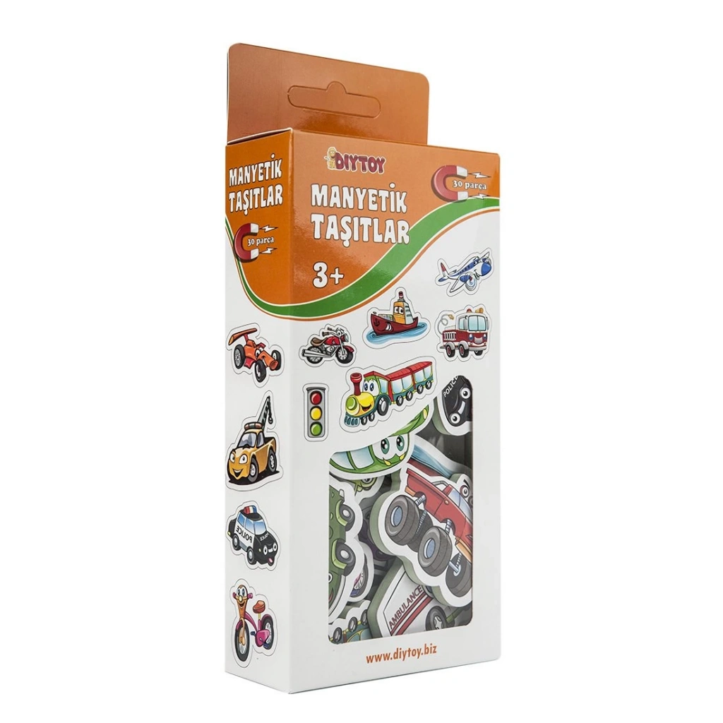 içinde bulunan 30 manyetik taşıt figürü ile çocuklar araçları tanır.