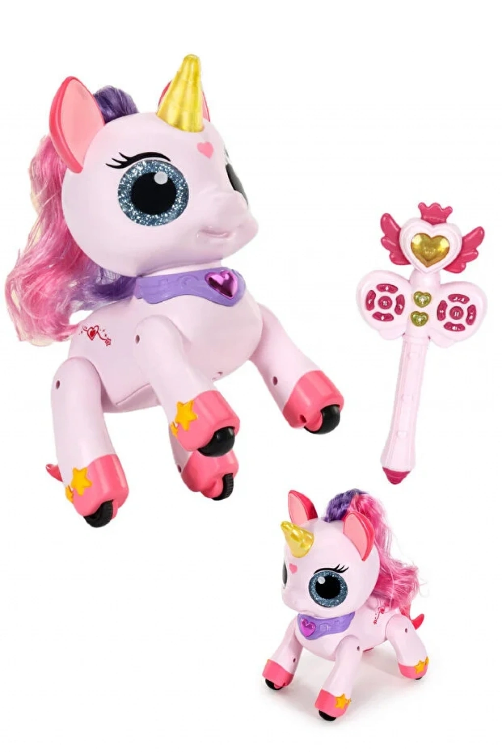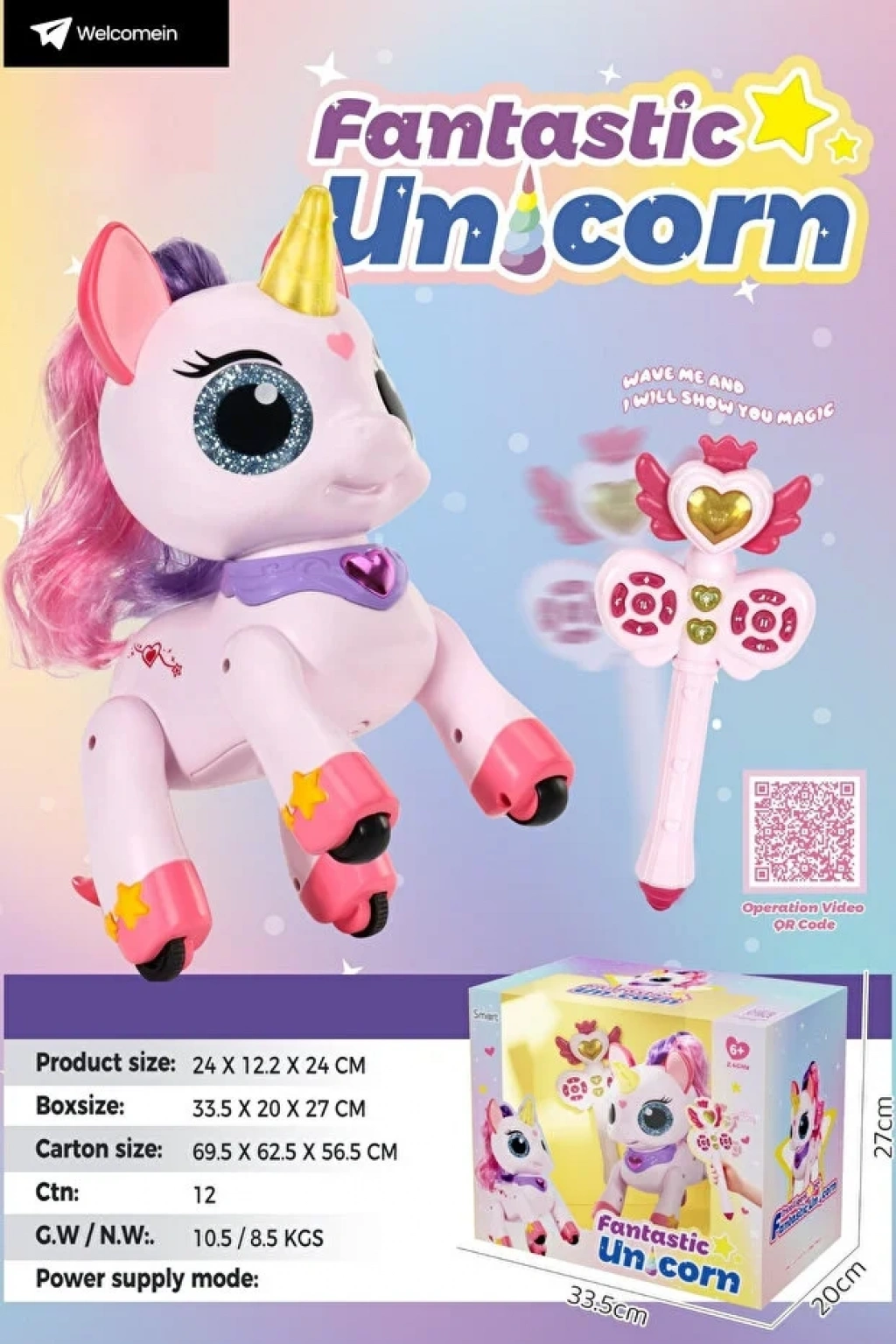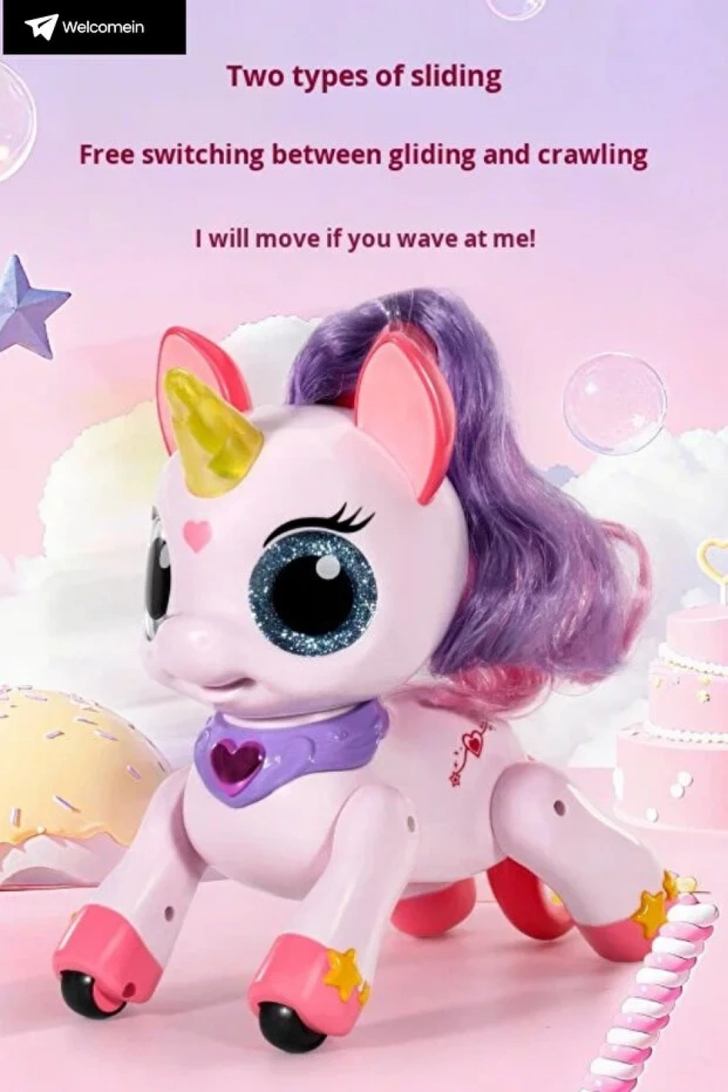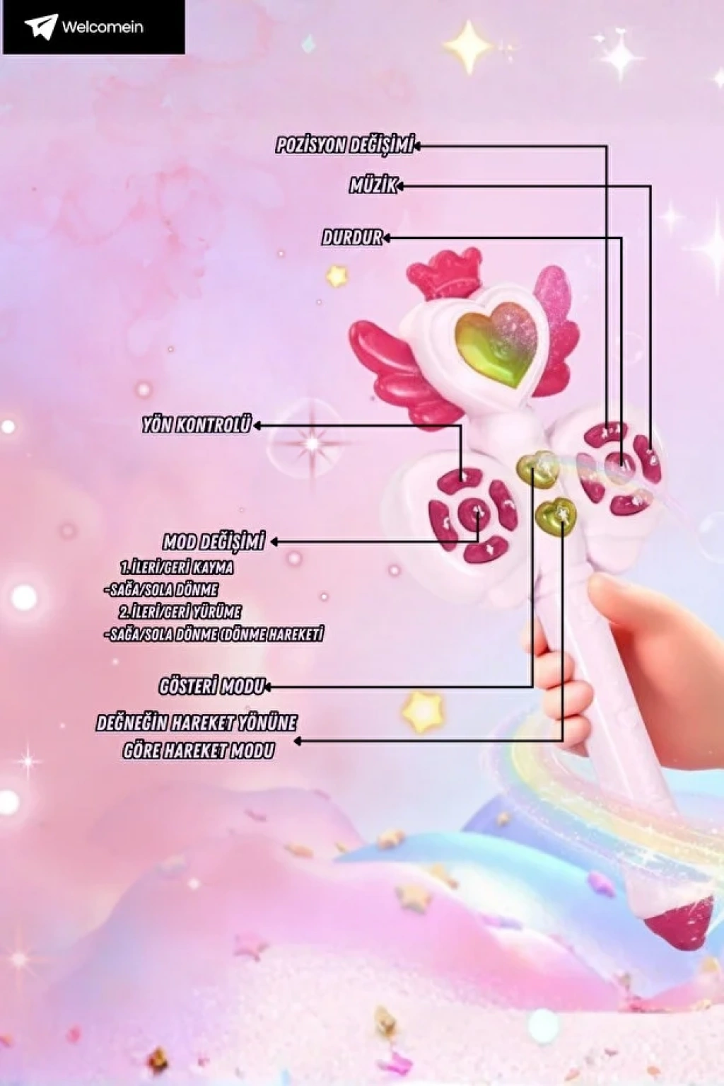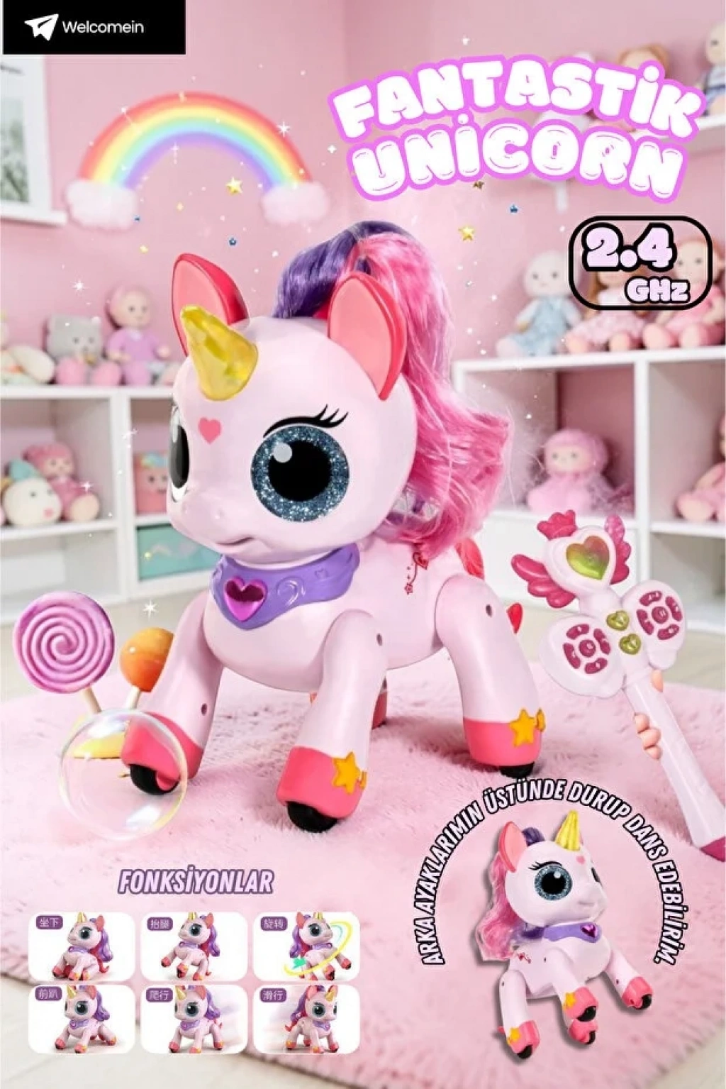 Sihirli asalı uzaktan kumandalı unicorn oyuncağımız, 22 cm boyunda, 2.4GHz frekanslı kontrol sistemiyle hem çocuklar hem de koleksiyoncular için eşsiz bir deneyim sunar. Bu etkileşimli unicorn, dans eden hareketleri, ışıklı ve sesli özellikleriyle çocuğunuzun hayal gücünü harekete geçirir ve oyun saatlerini unutulmaz kılar. Full fonksiyonlu uzaktan kumanda sayesinde unicornu ileri, geri, sağa ve sola hareket ettirebilir, dansını başlatabilir, ışık ve müzik efektlerini kontrol edebilirsiniz. Unicornun saçlı tasarımı ve sihirli asası, gerçek bir fantastik deneyim sunarken, çocukların interaktif oyun yeteneklerini geliştirir.